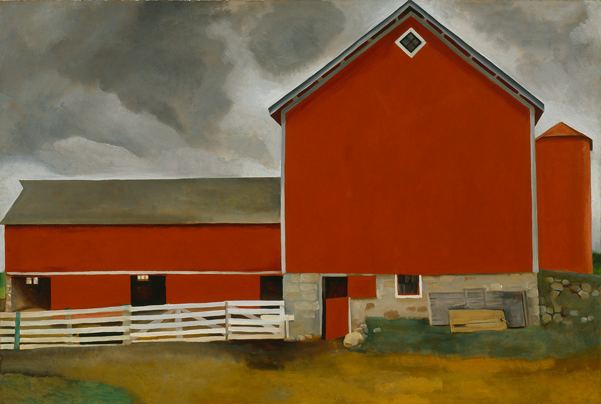 Image: Georgia O’Keeffe (American, 1887–1986). Red Barn, 1928. Oil on board, 24 x 36 inches. Private collection