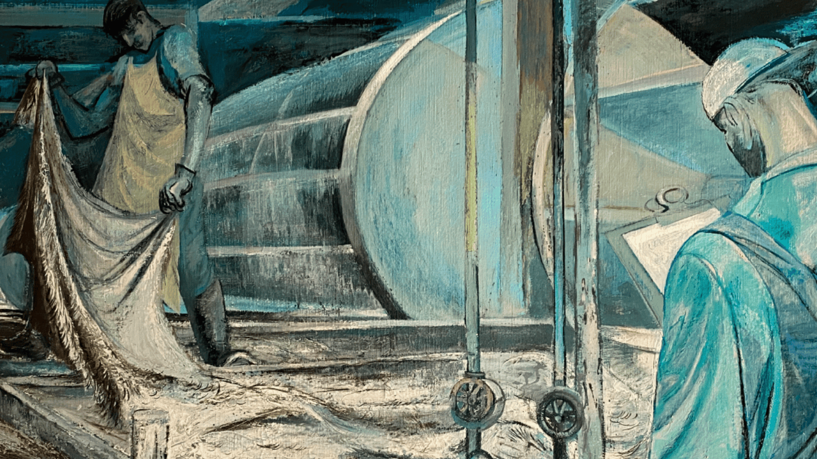 As part of Albert Trostel & Sons’ centennial celebrations in 1958, Boggs was asked to “portray and interpret the strength and character of leather tanning.” His work commemorates the backbreaking labor and increasing use of industrial machinery that helped propel the company to the forefront of the leather industry. “These stunning nine canvases by Franklin Boggs detail in vivid color the craft of tanning, serving as a testament to hard work and time-honored industrial practices,” said Graeme Reid, Senior Curator at MOWA.